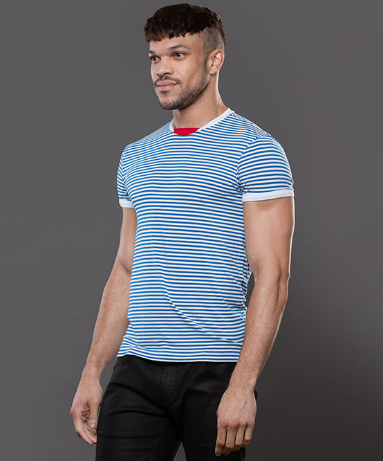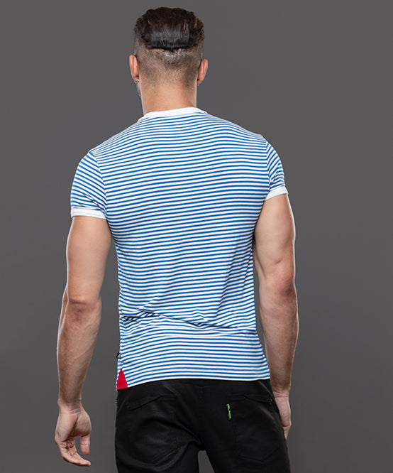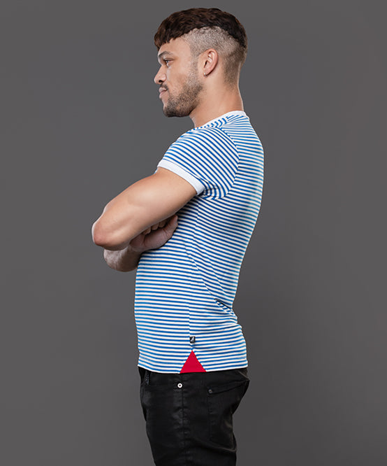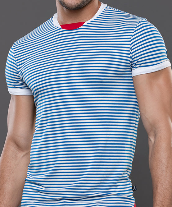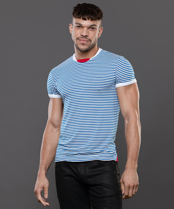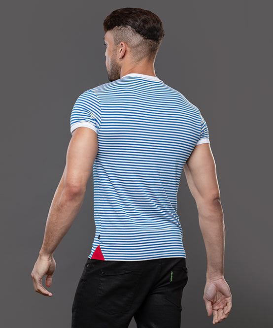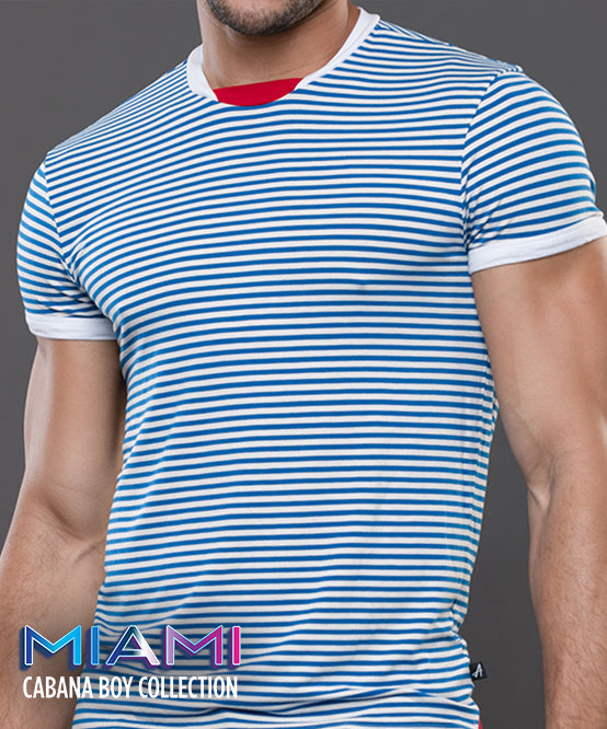 The Miami Cabana Boy Ocean Drive Tee is your ticket to sailor fantasy realness. With crisp blue-and-white stripes and retro ringer trim, it’s giving classic French Riviera with a splash of South Beach sass. Soft, stretchy, and cut to hug just enough, this tee looks just as good tucked into tiny shorts as it does tossed aside at the pool. Anchors not included. And thanks to the limited edition design and slimming, form-fitting cut, this will quickly become your favorite tee. Easy, breezey, and hot AF.